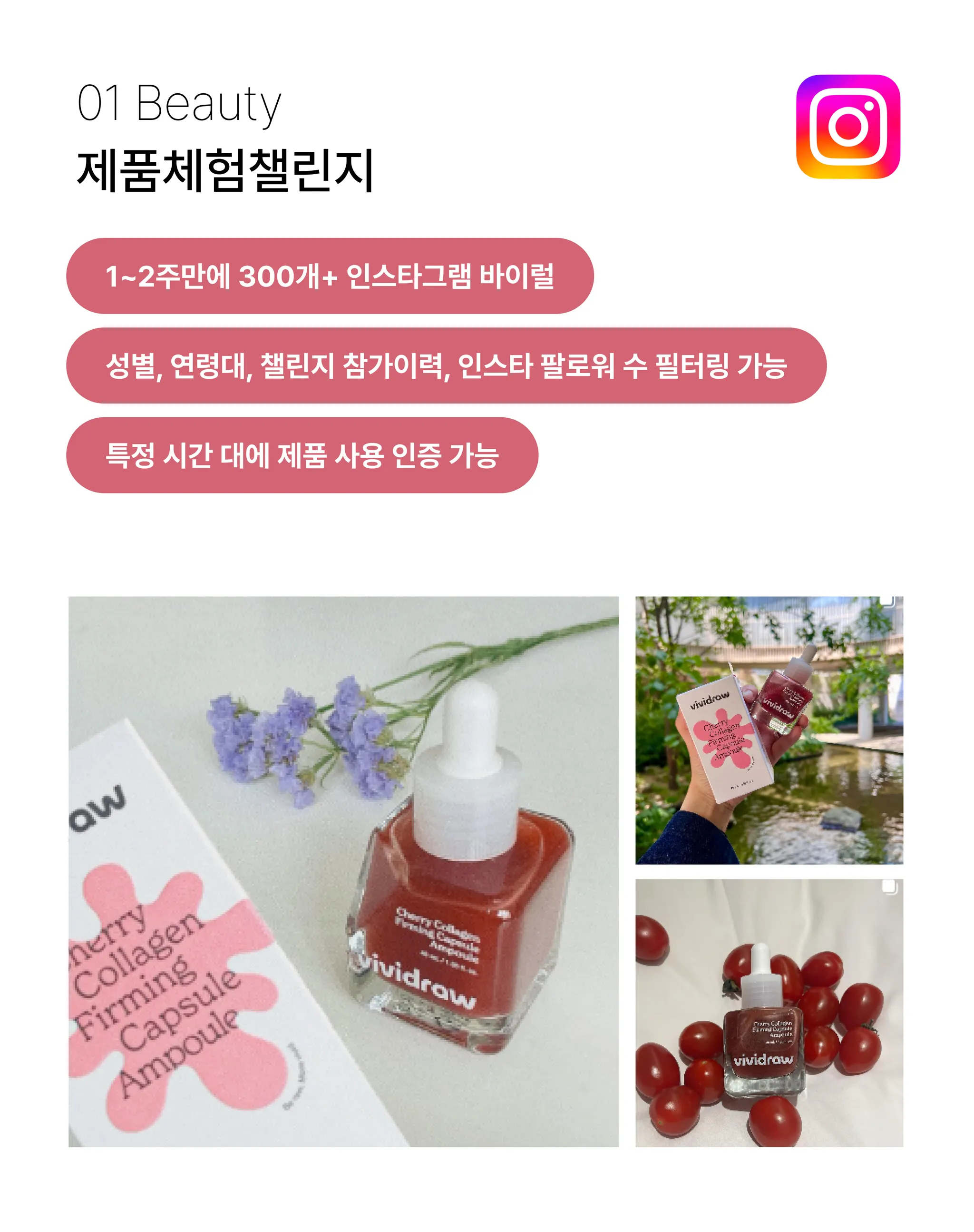 신규 런칭 혹은 리뉴얼 제품에 대해 1~2주 만에 300개+의 인스타그램 바이럴을 확보할 수 있습니다. (체험단 운영과 가장 유사)